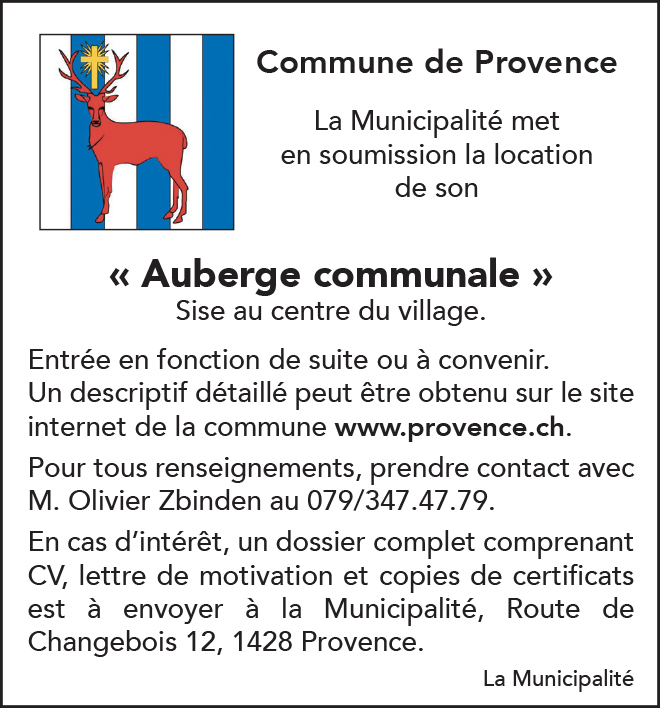 En cas d’intérêt, un dossier complet comprenant CV, lettre de motivation et copies de certificats est à envoyer à la Municipalité, Route de Changebois 12, 1428 Provence.