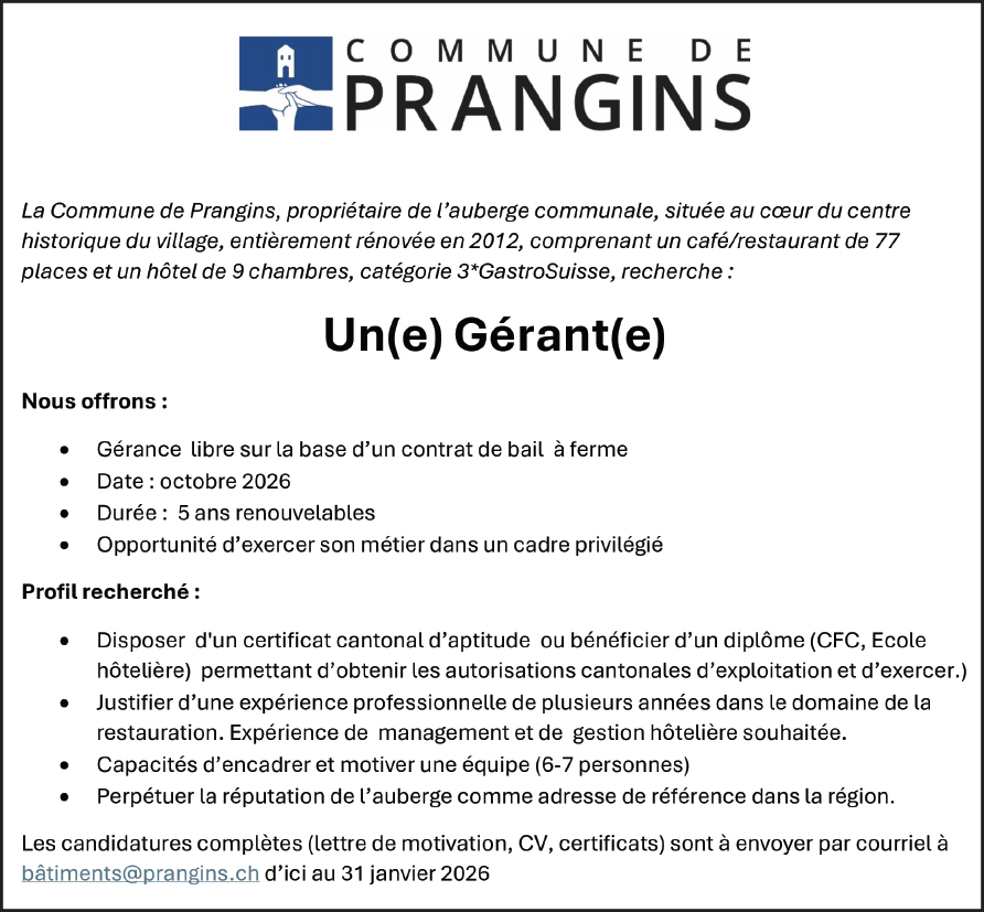La Commune de Prangins, propriétaire de l’auberge communale, située au cœur du centre historique du village, entièrement rénovée en 2012, comprenant un café/restaurant de 77 places et un hôtel de 9 chambres, catégorie 3*GastroSuisse, recherche :