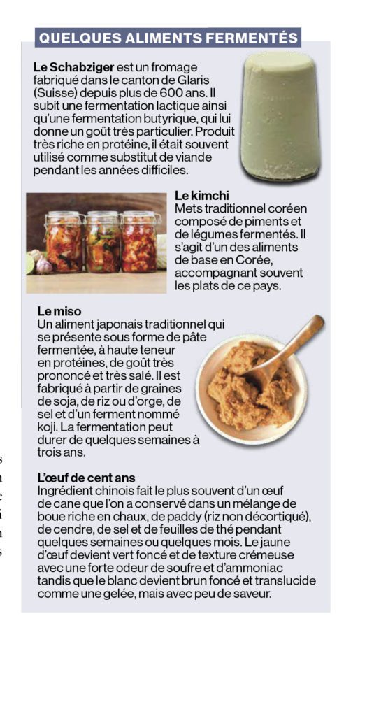Bière, vin, cornichons, choucroute, pain, fromage, vinaigre, citrons confits, kombucha, kimchi, kéfir, yaourt, miso, œuf de cent ans… Qui a-t-il de commun entre tous ces mets et boissons ? Ils se mangent et se boivent bien sûr, et surtout ils sont le résultat de processus de fermentation divers et variés maîtrisés par l’homme depuis la nuit des temps.Les premières utilisations de la fermentation remontent au Néolithique (-9000 ans). Une période qui coïncide avec la sédentarisation, ayant pour corollaire le stockage d’aliments. Historiquement donc, la fermentation a été utilisée pour conserver les aliments. Cette réaction conduit à la production d’acides organiques, qui sont des conservateurs efficaces grâce à leur rôle antimicrobien. C’est le cas par exemple de l’acide lactique, à l’origine d’une diminution du pH du milieu qui empêche le développement des micro-organismes pathogènes.