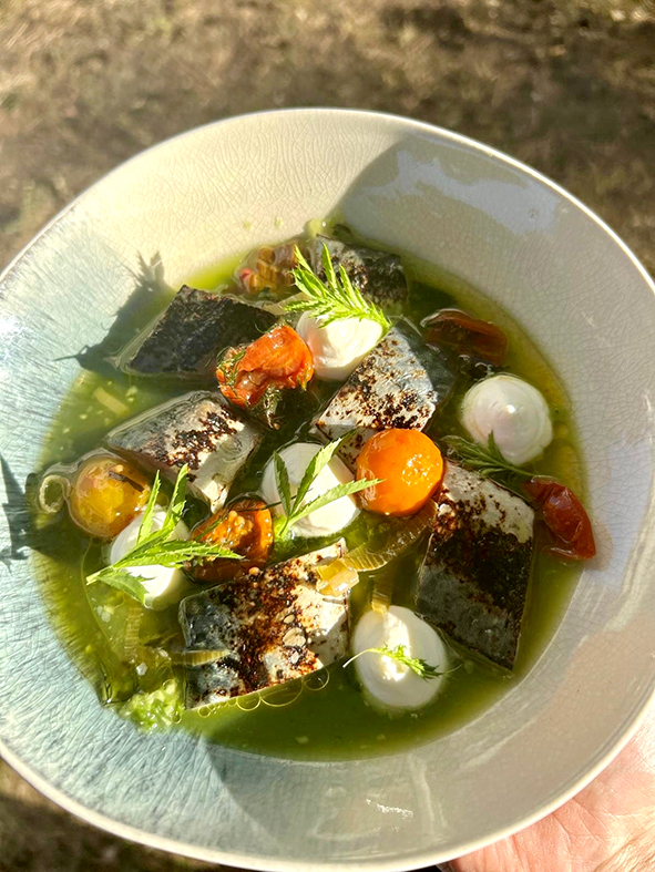 Lorsqu’on lui demande de nous citer les plats les plus emblématiques du restaurant, elle répond sans l’ombre d’une hésitation : « Ce ne serait pas très judicieux, car nous renouvelons notre carte en permanence. Je préfère vous parler de nos produits et de nos fournisseurs les plus représentatifs ». Elle cite alors les fruits et légumes des Potagers de Gaia, à Hermance ; les produits de la ferme biologique de la Touvière, à Meinier, ou encore la Crèmerie végane de Genève, et bien d’autres. Quant aux vins, ils sont tous « locaux » : La Devinière à Satigny, la Mermière à Soral, Château L’Evêque à Jussy, Château du Crest à Jussy, etc.