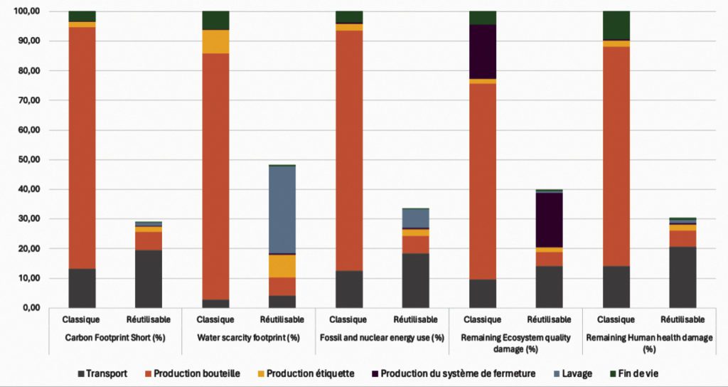 Grâce à la phase pilote qui a duré près de deux ans, Bottle Back a pu travailler sur plusieurs aspects sur lesquels il y avait encore des points d’interrogation pour apporter des réponses claires aux vignerons qui souhaitent rejoindre ce système et aussi pour trouver des solutions pour les consommateurs et pour toute la filière. Plusieurs études ont été menées. Elles ont porté sur des étiquettes hydrosolubles ainsi que l’hygiène des bouteilles à la sortie du lavage. Une étude sur le cycle de vie des flacons a montré que réutiliser une bouteille utilise 50% d’eau en moins et que cette approche est beaucoup moins gourmande en énergie.