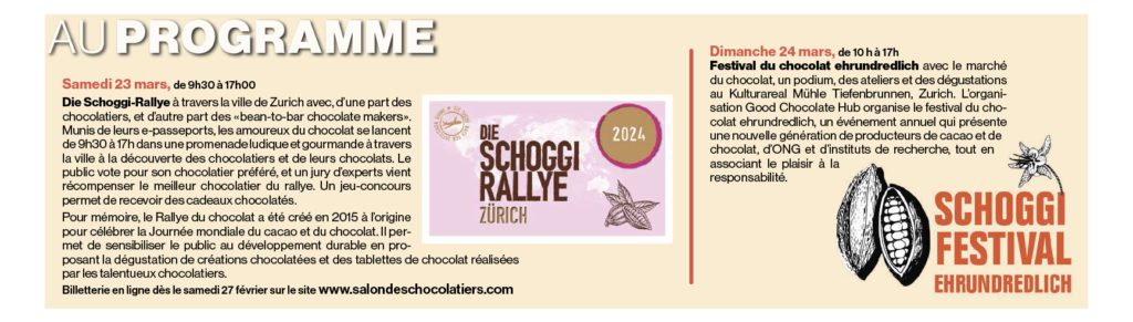 Lise Luka piaffe d’impatience. L’organisatrice du très couru Rallye du Chocolat de Genève s’apprête à franchir la Sarine pour ravir les gourmands de Zurich une nouvelle fois après une première édition dans la grande ville alémanique en 2022. Une première tentative qui avait attiré quelque 700 amateurs. Certes, comparé à Genève qui a engrangé 4500 inscriptions en octobre dernier, cela peut paraître peu.Cette année, il y a fort à parier que le public sera plus nombreux de l’autre côté de la barrière des rösti. La raison ? Lise Luka s’est associée à l’instigatrice du Festival du chocolat ehrundredlich, dont la mission est de prôner la durabilité, l’équité, et le respect des producteurs de cacao. Les deux organisatrices planifient donc un week-end entièrement dédié au chocolat qui devrait stimuler les papilles, le cœur et l’esprit. Les visiteurs pourront découvrir des créations chocolatées spécialement réalisées pour l’évènement, des ateliers, des conférences et des dégustations. Le Die Schoggi-Rallye (Rallye du Chocolat) s’étend sur plusieurs sites dans le centre-ville, ce qui permet aux participants de se lancer dans un voyage chocolaté à travers Zurich. Le Schoggifestival ehrundredlich se déroulera au Mühle Tiefenbrunnen, où les familles et les amateurs de chocolat pourront déguster des chocolats « honnêtes et loyaux », chercher des œufs de Pâques et poser un regard critique sur leurs chocolats préférés dans une ambiance chaleureuse et festive.