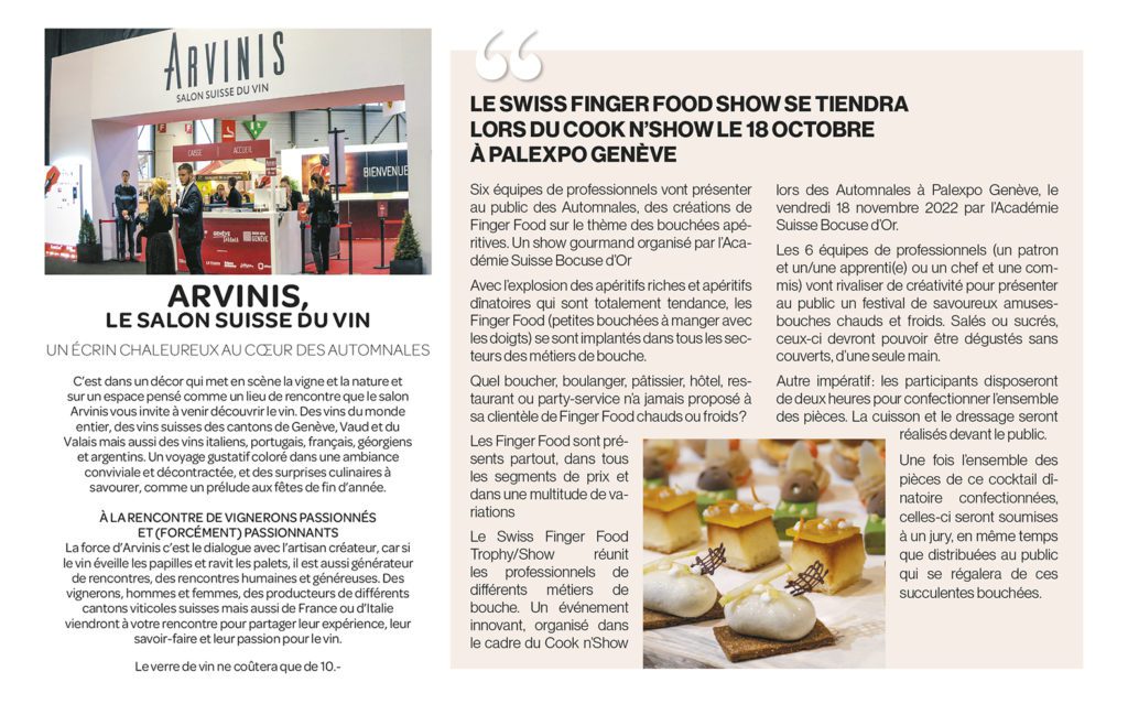 Le plus grand événement gastronomique de Suisse romande remet le couvert sur quatre espaces 100% gourmands. Plusieurs défis sont au programme, à commencer par le Cook’n’cheese, un concours amateur et professionnel sur le thème de la fondue au fromage avec, à la clé, une qualification pour la finale du Mondial de Fondue à Tartegnin du 17 au 19 novembre 2023.Côté douceurs, la Swiss Pastry Cup by Christophe Renou, un concours de pâtisserie et de chocolat réservé uniquement aux professionnels, est le rendez-vous sucré incontournable, présidé par Frank Michel, Meilleur Ouvrier de France2004. Il se tient le 14novembre.Les gourmets ne manqueront sous aucun prétexte le Marché des saveurs. Ils y trouveront des producteurs locaux et des stands d’épicerie fine. Des masterclass, ateliers, dégustations, conférences, concours amateurs et professionnels, et animations en tous genres seront également au programme sur l’espace de l’Atelier des saveurs.