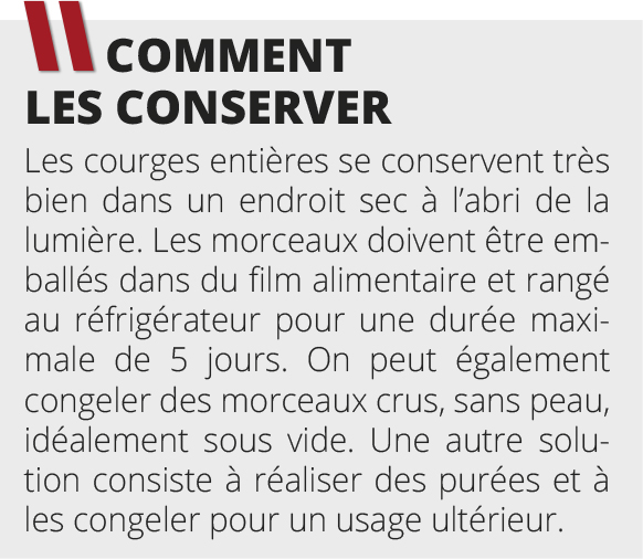 Enfin, cerise sur le gâteau, l’apprêt des courges n’a de limite que notre fantaisie. En cuisine, les courges se prêtent à une infinité de préparations : soupes onctueuses, gratins, tartes salées ou sucrées, gnocchis, flans, confitures… Leur goût doux se marie aussi bien avec les épices (cannelle, muscade, curry) qu’avec les fromages, les noix ou les fruits secs.