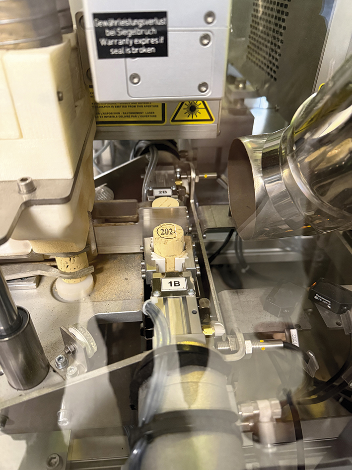 Chez Gaud, les bouchons sont dépoussiérés. Leur surface est traitée à la paraffine et au silicone pour la glisse et pour éviter qu’il y ait des remontées de capillarité. Les bouchons sont ensuite marqués au laser avec les visuels envoyés par chaque client.