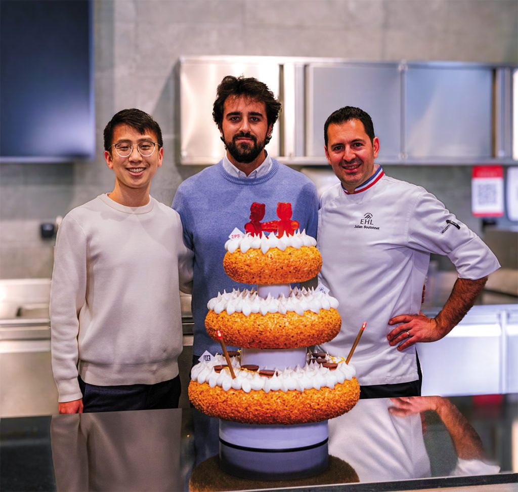 Pour rendre ces innovations appétissantes et s’assurer que leur consommation est sans danger, les ingénieures et ingénieurs se sont associés aux experts en alimentation et aux pâtissiers de l’EHL. « Notre défi était de trouver la meilleure manière de mettre en valeur les inventions de nos deux partenaires, l’EPFL et l’IIT, en y ajoutant ce que nous faisons de mieux : l’indulgence. C’est ainsi qu’est né RoboCake, un véritable gâteau festif, qui relève le défi de combiner technique, électronique et plaisir gustatif », exprime Julien Boutonnet, maître d’enseignement senior en arts pratiques à l’EHL et détenteur de l’une des distinctions les plus prestigieuses du domaine, celle de Meilleur Ouvrier de France (MOF) pour la pâtisserie et la confiserie.« Cette collaboration interdisciplinaire ouvre la voie à des expériences gastronomiques interactives et délicieuses, tout en nous rappelant au passage que la nourriture est une ressource précieuse et en nous incitant à réduire la suralimentation », ajoute Dario Floreano.