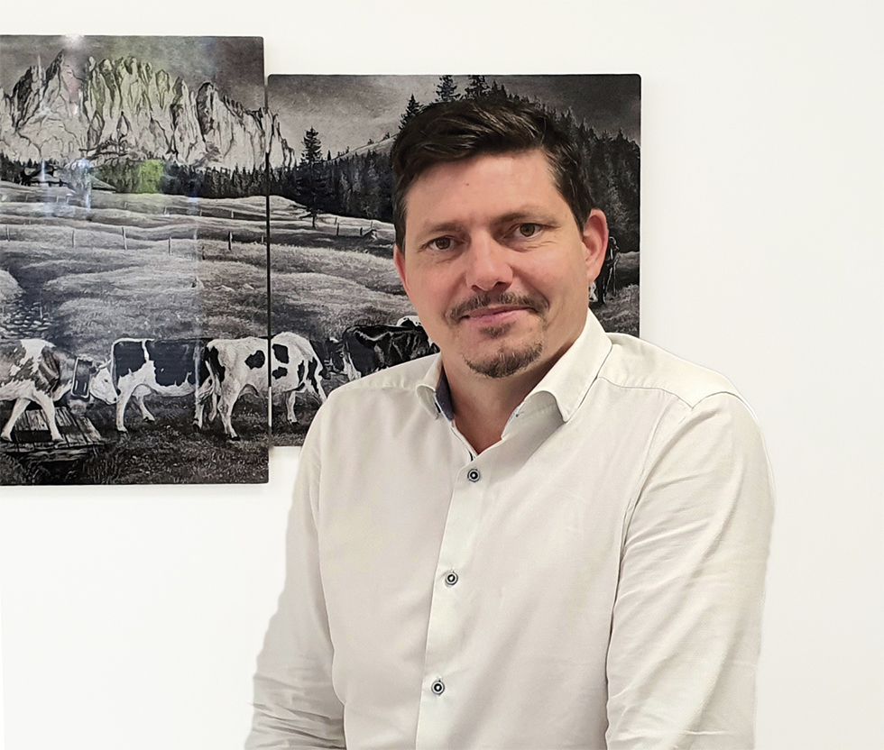 Mince moustache et petite barbe finement taillées, il approche de l’image qu’on se fait de d’Artagnan, la longue chevelure en moins. Et lorsqu’on lui fait remarquer qu’il ressemble à un mousquetaire du roi, Romain Castella acquiesce de bonne grâce, avec un petit sourire amusé. Directeur de l’Interprofession du Vacherin Fribourgeois AOP (IPVF) depuis 2017, cet homme élégant reste, à 40 ans, fier de ses origines rurales. Avec son équipe, il se dévoue corps et âme pour faire mieux connaître le second fromage le plus emblématique de son canton et lui faire gagner de nouvelles parts de marché. Non sans succès !