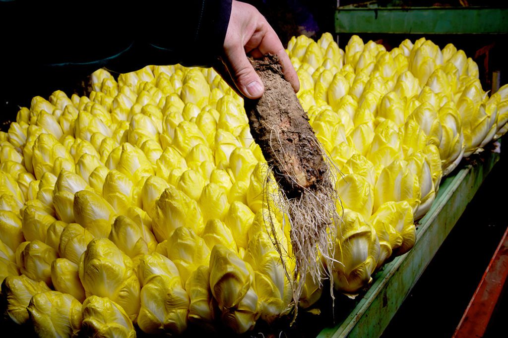 La culture de l’endive se déroule en deux étapes principales : la production des racines et le forçage. Tout commence par la semence de la chicorée, généralement entre avril et juin. Les plants sont cultivés en plein champ pendant environ 4 à 5mois, jusqu’à ce que les racines atteignent une taille suffisante.Une fois les racines récoltées à la fin de l’automne, elles sont stockées dans des conditions fraîches et sombres. Elles peuvent ainsi être conservées ainsi pendant au moins 10mois.Au fur et à mesure des besoins, les racines sont plantées dans de grands bacs superposés en chambre noire. Ce processus permet à l’endive de croître à l’abri de la lumière, ce qui lui confère sa couleur blanche et sa texture croquante.