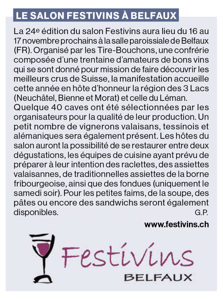 « Cette année, nous célébrons les dix ans de notre charte du Vully. En la signant, nos vignerons s’engagent pour la qualité de nos deux spécialités blanches les plus emblématiques, à savoir le Freiburger et le Traminer. Chaque année, nous désignons, collectivement à l’aveugle, deux vins par cépage, qui entrent dans notre œnothèque. Les Caves de Noël sont une belle occasion de déguster les plus récents de ces vins d’exception », souligne encore Joanna Rouiller. Deux mots des dernière vendanges ? « Elles s’annoncent très prometteuses pour les rouges. Les nuits ont été fraîches ce qui leur a été profitable. 2024 sera une belle année, même si quantitativement, nous devrions avoir une petite baisse ». Dernière précision : plusieurs vignerons-encaveurs du Vully seront présents au Salon Festivins organisés à Belfaux, les 16 et 17 novembre prochains (cf. encadré).