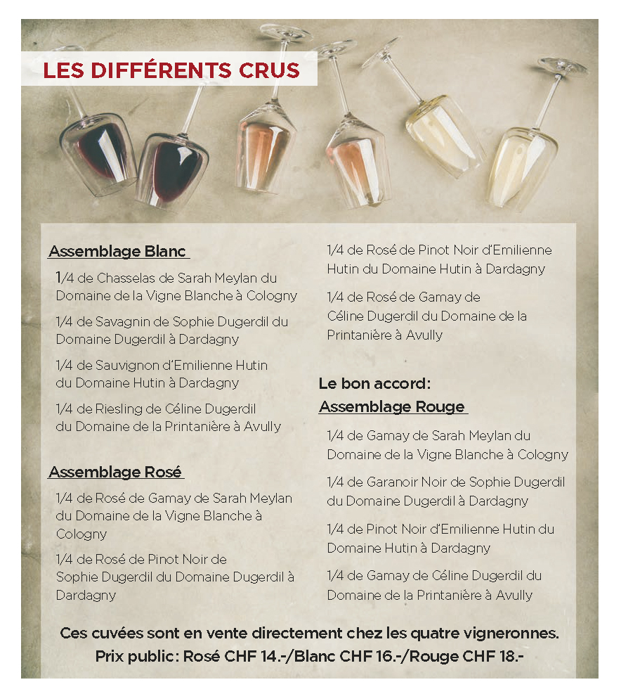 Quatre vigneronnes ont profité de la mise en lumière de Genève cette année pour mieux faire connaître l’excellence des nectars genevois. Sous l’impulsion de Brigitte Turin, ambassadrice de l’association : Nous Artisanes du Vin, Sarah Meylan, Céline Dugerdil, Emilienne Hutin et Sophie Dugerdil se sont alliées pour créer une cuvée limitée déclinée en blanc, rouge et rosé afin de mettre en lumière les caractéristiques du terroir cantonal. Les trois crus illustrent à merveille le terroir cantonal.