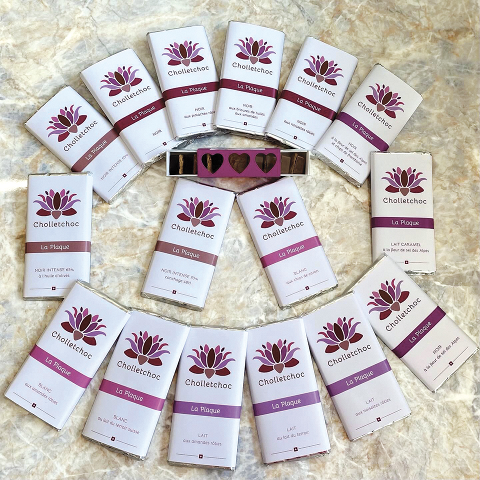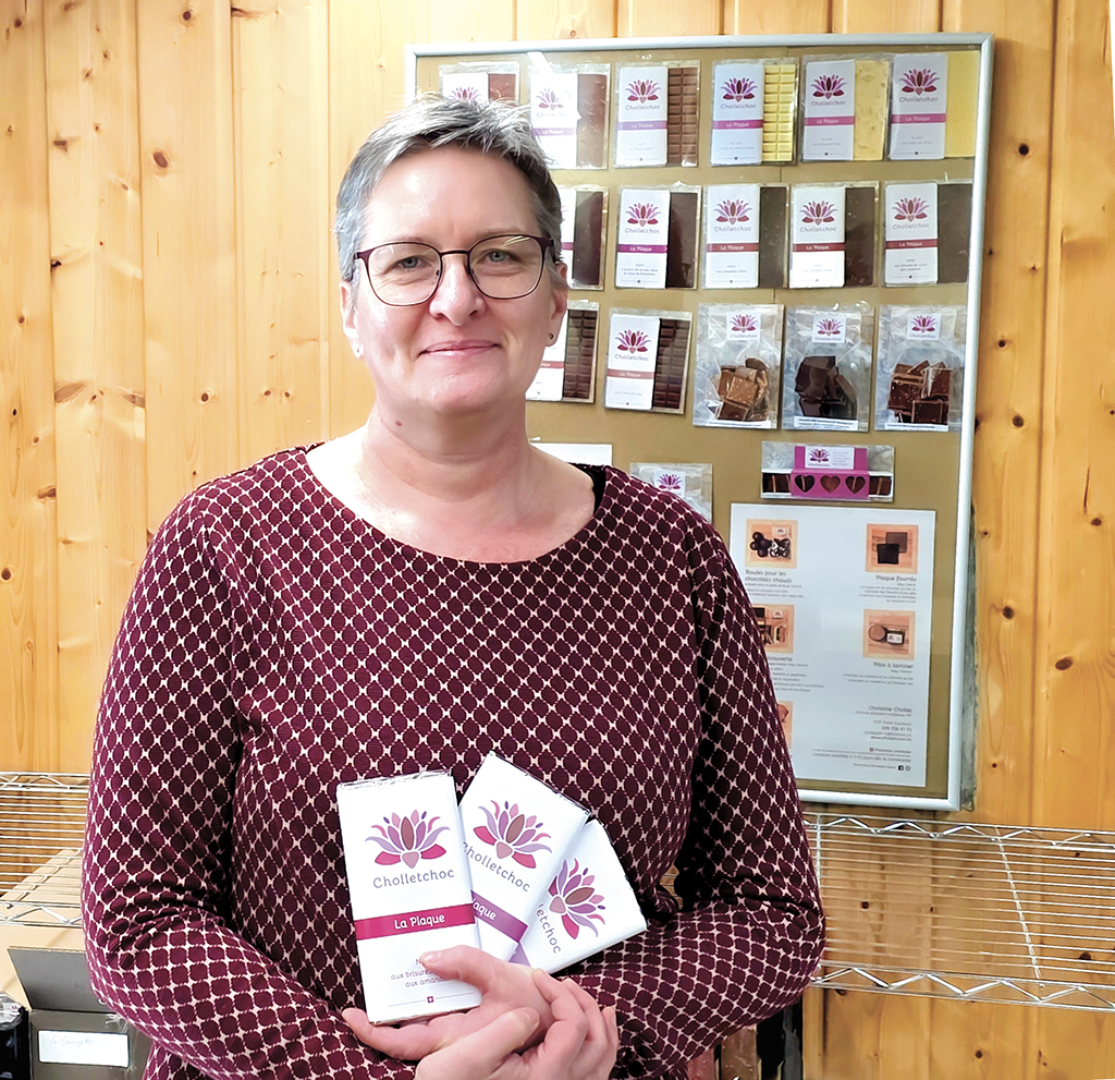 À sa petite entreprise, elle a donné le nom de « Cholletchoc ». Sa boutique en ligne offre une riche variété de chocolats les uns plus savoureux que les autres: aux amandes ou aux noisettes rôties, à la fleur de sel des Alpes, au piment d’espelette, etc. Les gourmandises chocolatées de cette infatigable et créative quinquagénaire sont également en vente dans divers commerces de proximité de la région : Le Nid d’Abeille à Forel ; le Self des Amoureux à Puidoux ; le Petit Magaz, à Mézières, etc. La liste complète figure sur son site en ligne.