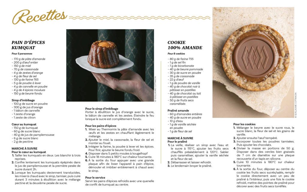 T. C. : Cette année, j’ai imaginé une bûche de Noël aussi poétique que savoureuse, tel un livre ouvert. Symbole de connaissance, d’évasion et de réconfort pour ces périodes tant attendues, ce livre invite au lâcher-prise et à la découverte. À l’image de la haute gastronomie, il dévoile une palette d’émotions riches et subtiles. Cette bûche est comme un récit gourmand, où chaque page est une promesse de partage et de plaisir. La bûche « livre » se décline en deux tomes gustatifs aux parfums variés, chocolat-noisette ou exotique, et est entièrement sans gluten. Le premier tome offre un croustillant de chocolat noir et noisettes torréfiées, surmonté d’un biscuit au chocolat, d’un crémeux au caramel, enveloppé dans une mousse légère de chocolat noir et pâte de noisette. Le second, d’inspiration exotique, combine un croustillant de chocolat blanc et noix de coco torréfiée avec un biscuit pain de gênes à l’amande et au citron vert, sublimé par un crémeux exotique et une mousse aérienne de coco et fruit de la passion.