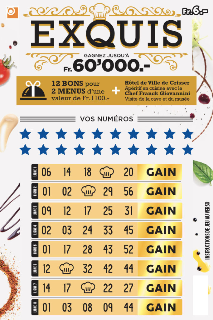 Ce nouveau jeu gourmand de la Loterie Romande fait fureur dans les kiosques depuis le 20 août, exclusivement en Suisse romande.À la clé, pour les plus chanceux : 12 bons pour 1 repas pour 2 personnes à l’Hôtel de Ville de Crissier après un apéro en cuisine avec le chef Franck Giovannini. Un joli lot d’une valeur de CHF 1100.- auquel s’ajoute la possibilité de gagner jusqu’à CHF60000.-.