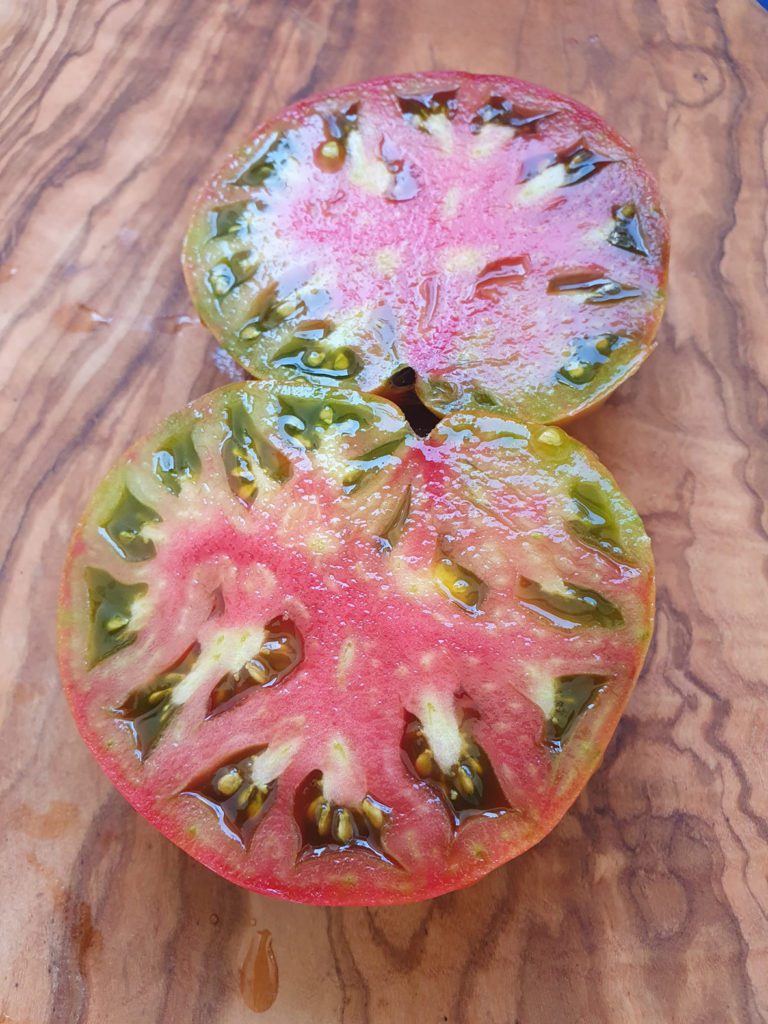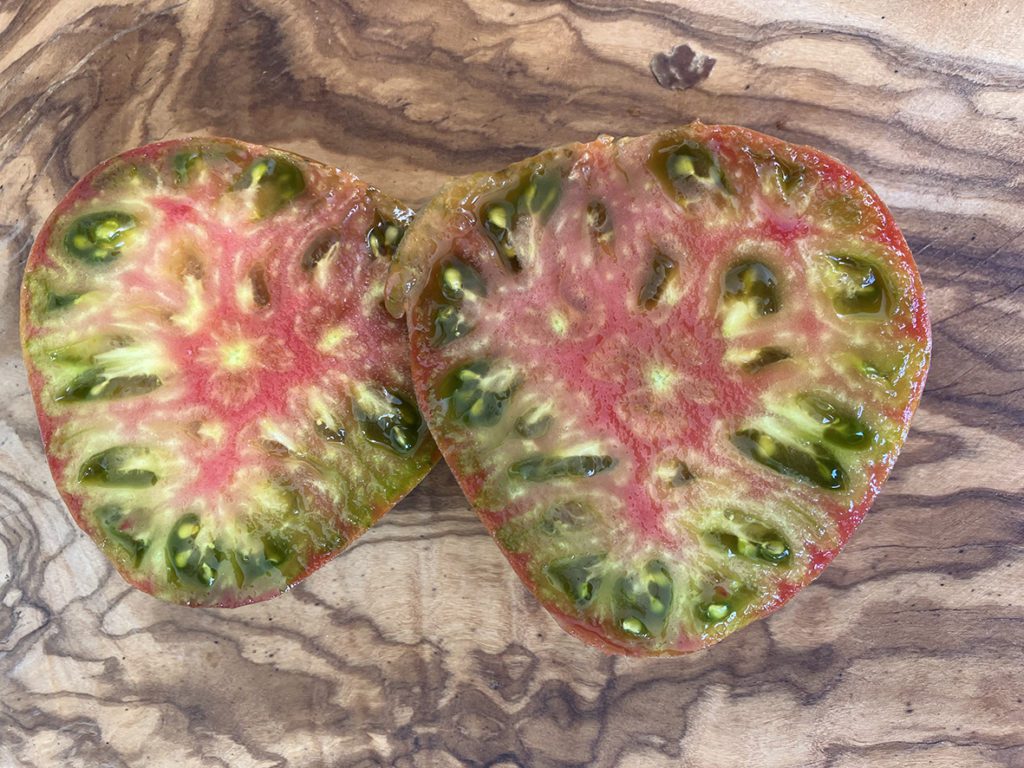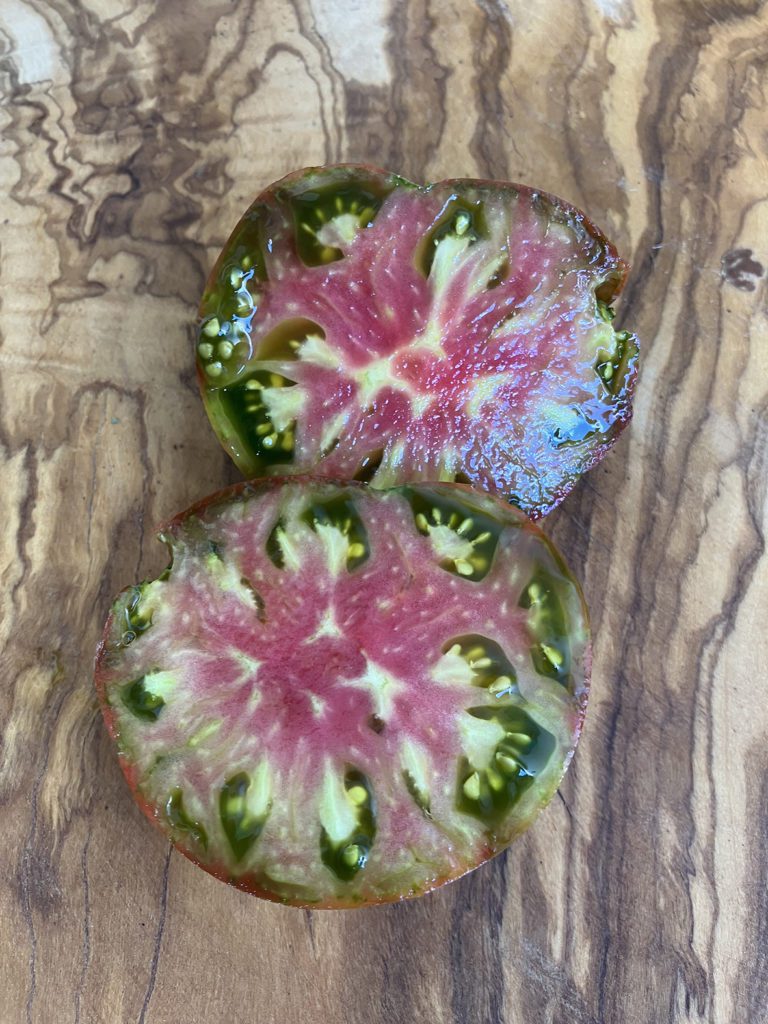 Au cœur de l’été, Mickael nous a ouvert les portes de ses serres extraordinaires. « Ici, nous cultivons de l’Ananas Zebra, issue d’un croisement entre une tomate Ananas et une Green Zebra, des Brad’s Black Heart, des tomates bien noires, qui ont un goût très charpenté, assez puissant, un peu comme les Noirs de Crimée. Il y a aussi l’Everett’s Rusty Oxheart qui ressemble à une Cœur de bœuf, mais qui est toute colorée à l’intérieur. Une tomate ultra sucrée avec une pointe d’acidité et une longueur en bouche persistante. En termes de goût, elle décroche un 10/10. »