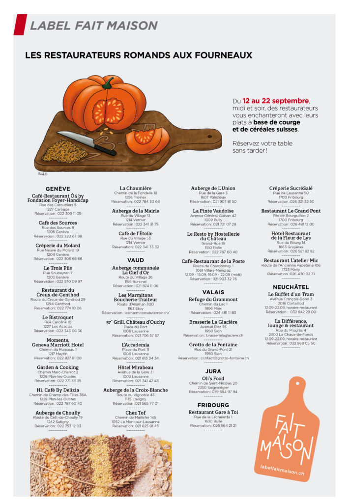En Suisse romande, des centaines d’événements sont à l’affiche de cette édition 2024. Les restaurateurs ne sont pas en reste. Une quarantaine d’établissements labellisés Fait Maison proposent de revisiter les céréales en les agrémentant de courges colorées.